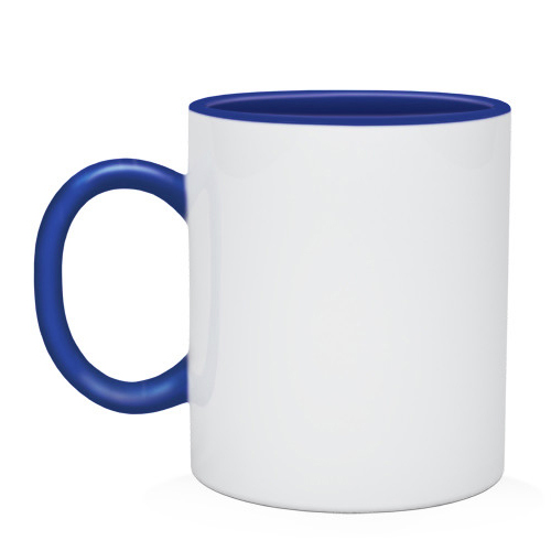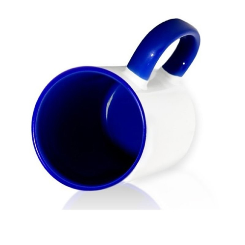 Стильная кружка белого цвета с полимерным покрытием для сублимации. Ручка и внутренняя поверхность - синие.